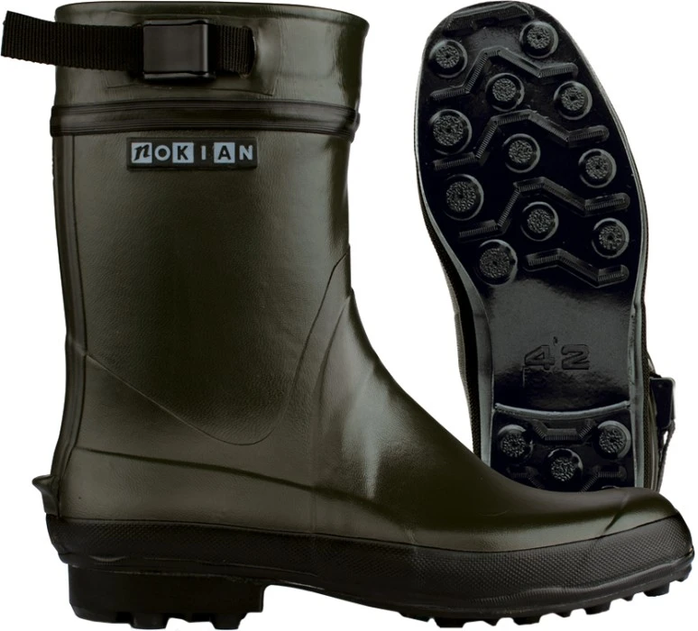 Nokian Finntrim -kumisaappaissa on kapeampi varsi, jota voi säätää helposti remmillä varren yläosasta. Kevyt ja mukautuva saapas takaa kuitenkin jokaisella askeleella vakaan askelluksen jalalle. Teräsvahvike välipohjassa lisää vakautta, käyttöikää sekä vääntöjäykkyyttä taaten näin monen vuoden mukavan käyttökokemuksen. Ulkopohjassa on karkea kuviointi, joka takaa hyvän pidon kaikenlaisilla alustoilla – myös märällä ja liukkaalla pinnalla. Pohjaan voi kiinnittää nastat talvikäyttöä varten. Saappaat on valmistettu käsin.