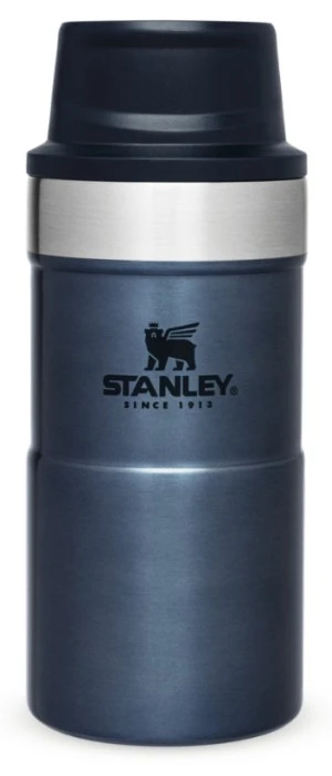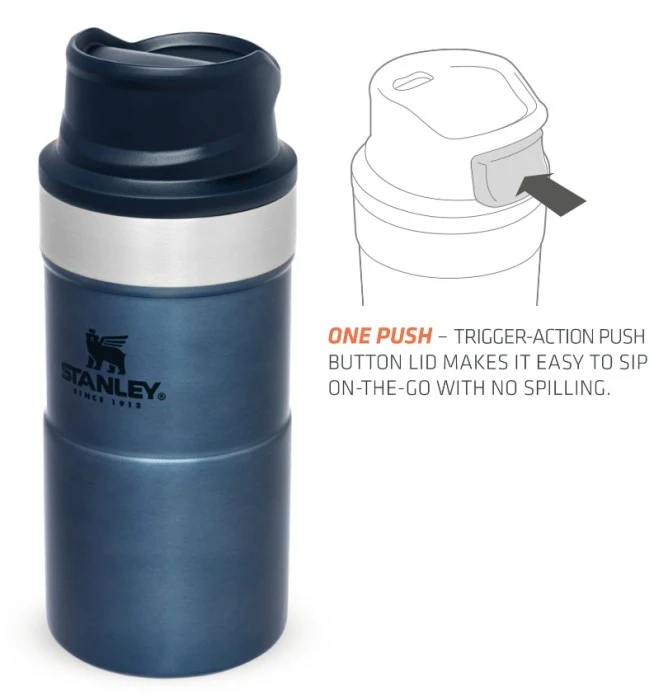 Stanley The Trigger-Action Travel Mug on läikkymätön, tyhjiöeristetty termosmuki, joka on valmistettu ruostumattomasta teräksestä. Mukia on helppo käyttää yhdellä kädellä, sillä siinä on automaattinen sulkumekanismi. Juomanokan päällä on myös kansi, joka suojaa nokkaa roiskeilta ja lialta. Trigger-Action-termosmuki pitää nesteen kuumana viisi tuntia ja viileänä jopa kahdeksan tuntia. Irrotettava kansi helpottaa puhdistusta, ja mukin voi pestä tiskikoneessa.