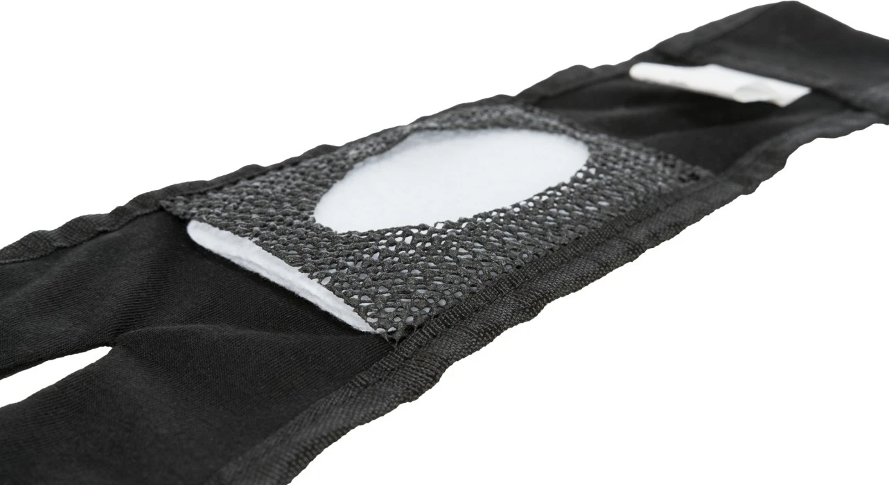 Narttusuoja koiran juoksujen ajaksi. Suojaa kodin pintoja ja tekstiilejä tahroilta. Hyvä istuvuus säädettävien hihnojen ansiosta. Pikalukkokiinnitys. Mukana tulee kolme vaihtosidettä. Koko XS: 20 – 25 cm.